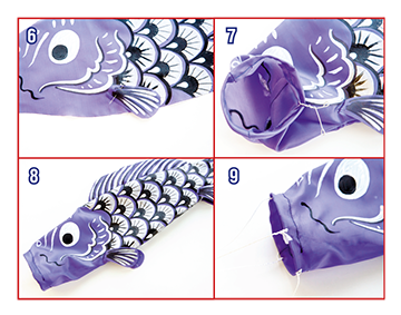 Выверни рыбу на лицевую сторону. Подогни внутрь края рта и прострочи или подшей руками, оставив вход для проволоки. Вставь отрезок жесткой проволоки или полоску упругого пластика. Они должны удерживать рот открытым (фото 7, 8).