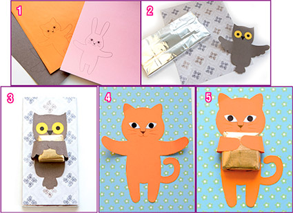 Такую зверюшку можно прикрепить двусторонним скотчем на шоколадку в самодельной обложке (фото 2), а в «объятья» еще и вложить конфету. На верхнюю ее часть – там, где будут лапки (или крылья) – тоже прикрепи кусочек двустороннего скотча (фото 3), чтобы она держалась.