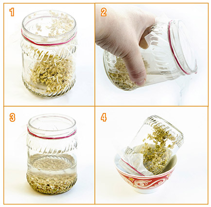 Насыпь в банку ложку семян (проростки – это лишь полезная добавка к еде, не нужно проращивать их сразу много). Накрой кусочком сетчатой ткани (тюль, фатин) и завяжи резинкой (фото 1).
