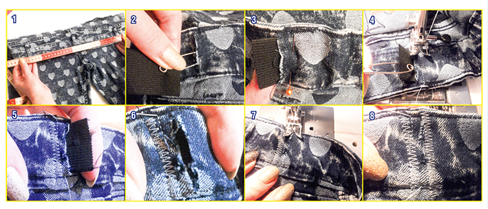 Шаг пятый: Теперь выведи свободный конец резинки через второй разрез. Здесь уже все зависит от того, насколько тебе велики джинсы или брюки. Лучше закрепи кончик наметкой и сделай примерку. Если тебе кажется, что брюки все еще сидят недостаточно туго, вытяни резинку еще больше. Когда окончательно определишься, пристрочи и второй кончик.