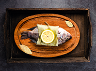 Тебе понадобится рыба общим весом около 1 кг (2 или 4 рыбины — например, сибас или дорадо). Почисти ее, головы не отрезай. Лайм, половину лимона и апельсин нарежь тонкими кружочками. Из оставшейся половины лимона выжми сок. Отрежь куски бумаги для выпечки такого размера, чтобы каждую тушку можно было легко завернуть.