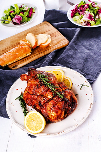 В комбайне до пастообразного состояния смешай все компоненты для маринада: 1 маленькую луковицу, ½ перца чили без семян, ½ небольшого сладкого перца, 1 зубчик чеснока, 2 пера зеленого лука, несколько веточек тимьяна, 4 ст. л. соевого соуса, 1 ст. л. растительного масла. Добавь джерк (1 чайную ложку) к маринаду. Обмажь смесью цыпленка, заверни в пленку и оставь в холодильнике на ночь. Жарь в закрытом гриле или духовке при 180 °С полтора часа.