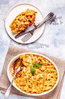 Творог (300–400 г) хорошенько разотри с половиной стакана варенья (вишневого или яблочного). Мелкие макароны (250 г) свари на молоке с водой (1 + 1 стакан), добавив соль (½ ч.л.), сахар (2 ст. л.) и ванилин (1 пачку). Вареные макароны откинь на дуршлаг. В чуть охлажденные макароны положи 50 г сливочного масла и хорошо перемешай. Добавь яйцо и перемешай еще раз. В жаропрочную форму выложи сначала половину макарон. Поверх нее распредели творожную массу с вареньем. И опять — слой макарон. На макароны выложи кусочки сливочного масла (еще 50 г) и поставь выпекаться в прогретую до 220°С духовку до образования золотистой корочки. Готовую макаронную запеканку можно подавать горячей или холодной, украсив ее оставшимся вареньем.