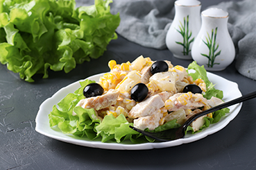 4. Открой банку с ананасами, но не спеши выливать всю жидкость. Ведь нам понадобится только половина содержимого. Измельчи ананасы на маленькие дольки и добавь к курице, маслинам и кукурузе.