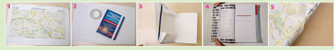 Серьезному и занудному словарю или учебнику по иностранному языку вполне можно придать более живенький вид. Для начала нужно замерить высоту книги и ее длину (в разложенном виде, вместе с корешком). Прибавь к каждой стороне по три сантиметра. После этого найди в интернете карту соответствующей страны (Франции, Англии и т.д.), распечатай ее на принтере. Если получится несколько отдельных листов, склей их между собой с изнанки, накладывая друг на друга. Удобнее всего использовать двусторонний скотч (фото 1, 2). Положи книгу на карту и оберни (фото 3, 4, 5). Лишние края можно аккуратно отогнуть по линейке с внутренней стороны (фото 7, 9). Чтобы все выглядело красиво, тоже закрепи их двусторонним скотчем.
