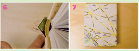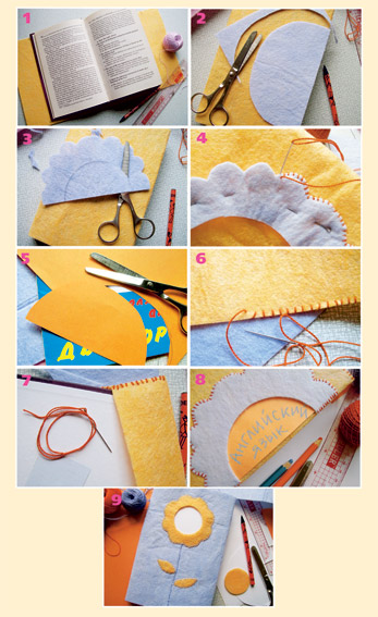 Для первого варианта вырежи полукруг в виде цветка с вырезанной серединой (фото 3, 4). Далее подверни края-кармашки и приложи аппликацию к линии сгиба. Закрепи булавками деталь аппликации. По краю (кроме внутренней стороны) пришей цветок обычным швом, имитирующим штопку (фото 5). Серединку оставь не пришитой. Вырежи из цветной бумаги полукруг чуть большего диаметра, чем внутренний полукруг цветка. Бумажная деталь будет служить табличкой с названием учебника, ее легко вынимать и вставлять, менять надписи или цвет бумаги по желанию. Декоративным швом обшей края обложки, захватив подгибы (фото 7,
