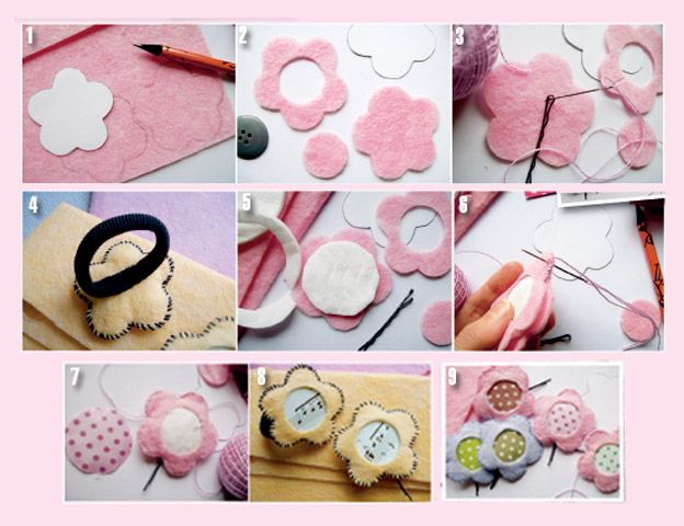 Заранее подбери плотную бумагу с орнаментом или любым другим рисунком для середины цветка, вырежи из нее круг диаметром на 5 мм больше того, что вырезан в центре цветка (7). Теперь, когда украшение сшито, можешь вставить серединку. В этом заключается небольшой секрет – серединки разных цветов легко менять, выбирая нужный вариант к любому наряду (8, 9). Такое украшение на невидимке можно использовать как заколку на волосы, а можно – как брошку, закрепив на вырез блузки или лацкан пиджака.