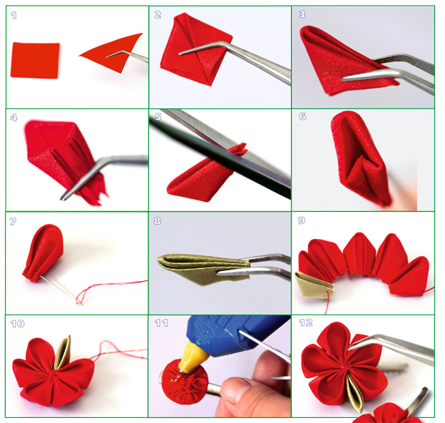 Для листочка берем квадратик ткани зеленого цвета и складываем его так же, как острые лепестки: пополам по диагонали, затем еще раз пополам и еще раз. Нанизываем все лепестки и листочек на нитку, стягиваем и завязываем.