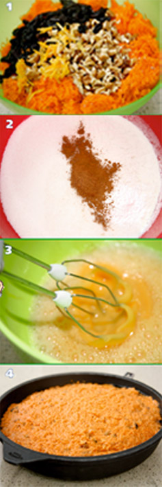 Самое тяжкое и, пожалуй, неприятное в приготовлении этого торта – это натереть столько сырой моркови, да еще и на мелкой терке. Будут предлагать помощь – не отказывайся! Должно получиться примерно 4 стакана. Однажды я решила немножко схитрить и провернуть вредный корнеплод через мясорубку. Увы, торт на меня обиделся и не пропекся... Не повторяй моих ошибок.