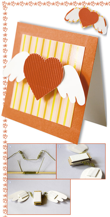 Подготовь два кусочка картона 3 х 1,5 см. Склей конструкцию: скотч + картон + скотч + проволока и крылышки + скотч + картон + скотч. Сними защитную пленку с задней части этого «бутерброда» и приклей его на основу открытки. Сними защитную пленку с передней части и приклей туда сердечко. Получится сердечко, приподнятое над основой открытки, и крылышки на пружинках, которые начинают трепетать от малейшего прикосновения.
