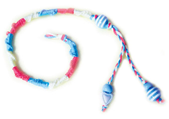 Постоянно меняя цвета нити, продолжай плетение узелков до необходимой длины. Закончив, закрепи плетение обычным узелком. Укрась бусинкой (фото 7).