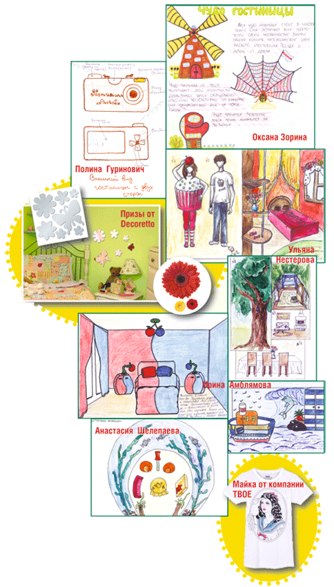 Девчонки, внимание! «Маруся» объявляет новый конкурс! Попробуйте придумать и изобразить необычный отель – и присылайте нам свои рисунки (с рассказом о нем, конечно же). Победителей ждут презенты от Decoretto – креативные наклейки на стены. Кроме того, самых изобретательных девушек мы наградим футболками от компании «ТВОЕ», созданными совместно с группой «Мумий Тролль»: музыкантов вдохновила морская тема, поэтому всякий, кто наденет такую вещицу, непременно окунется в атмосферу летнего отдыха даже зимой. И, конечно же, не обойдется без презентов от «Маруси»! Письма можно отправлять до 30 ноября (дата по штемпелю). На конверте сделайте пометку «На конкурс "Чудо-гостиница"».