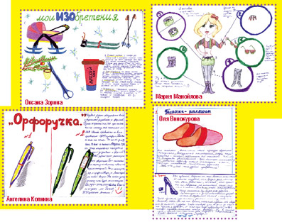 Оля отправила на конкурс целых семь изобретений. Мы по достоинству оценили и кольцо с фотокамерой, и тапочки-пылесосы, и серьги, меняющие свой цвет каждый час, и туфли с регулируемым по высоте каблуком, и очки, поднимающие настроение. Стоит их надеть – и все вокруг станет очень смешным. Оля предупреждает, что такой аксессуар нельзя надевать в школу. А то посмотришь в учебник – и задачку не решишь, весь урок прохохочешь. Также нам очень понравился музыкальный кулон, исполняющий желания. В него можно спрятать записку с именем любимого мальчика, который обязательно ответит взаимностью. А волшебное платье, надев которое сразу становишься стройной, захотела примерить вся прекрасная половина нашей редакции ![]()