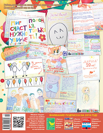 Ура!  Настало время подвести итоги нашего юбилейного конкурса (мы объявили его в «Марусе» № 5 и 6/2015). Итак, вот они – наши юные редакторы! Встречайте десятку победительниц! Работы у девчонок просто замечательные: яркие, красочные, с фантазией.