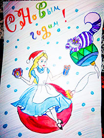 Еще один главный приз получает Екатерина Андреева из поселка Танзыбей, Красноярского края. Екатерина нарисовала Алису и Чеширского кота, парящих на новогодних шарах. Наверняка в Стране чудес так и проводят праздники :)