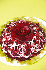 Сверху посыпать зерна граната. Сделать из свекольных ломтиков розу.