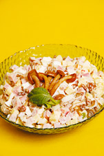 Яйца отварить (после закипания 8-10 минут), остудить, очистить от скорлупы. Ветчину, сыр и яйца порезать небольшими кубиками (приблизительно одинакового размера). Лук мелко нашинковать (если очень острый, обдать пару раз кипятком, затем холодной водой). Из банки с грибами слить жидкость. (Если грибы крупные, немного порезать, если мелкие, оставить так.) Добавить майонез, перемешать. Выложить все в салатницу. Солить не надо.
