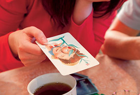 Как играть: Каждый по очереди придумывает ассоциацию к одной из своих карт, говорит ее другим участникам и кладет карту на стол рубашкой вверх. Ассоциации могут быть какими угодно – от простых («любовь», «одиночество», «сказка» и так далее) до самых невероятных («Дорогу покажешь?», «Мы так не договаривались!», «Чудеса в решете»). В общем, что в голову взбредет. Другие игроки выбирают среди своих карт ту, которая больше всего подходит к загаданной теме, выкладывают на стол тоже рубашкой вверх, а затем ведущий все карты перемешивает. После чего участники (кроме того, кто называл ассоциацию) голосуют, пытаясь отгадать, какая же именно карта была загадана. Если все справятся с этой задачей (или, наоборот, никто не сумеет этого сделать), загадывающий проиграет. Для победы нужно, чтобы карту хоть кто-то «опознал», но при этом – не все сразу. Так что придумывать надо что-то не слишком очевидное, но и не совсем заумное. Впрочем, когда начнешь играть, сразу поймешь, как это делать. Затем ход переходит к следующему игроку, и тогда ассоциацию придумывает он.