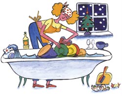 Гору грязных чашек и тарелок легче всего вымыть так: укладываешь все в ванну и заливаешь каким-нибудь средством для мытья посуды. Теперь достаточно взять в руки душ и, включив максимальный напор, хорошенько все пополивать. Не забудь предварительно в мусорное ведро скинуть с посуды кости, корки хлеба и т. д. и заткнуть слив ванны специальной пластмассовой сеточкой, а то придется вызывать сантехника с помпой.