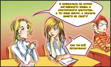 Как ты понимаешь, писать про плюсы, получаемые благодаря знанию иностранного языка, можно бесконечно. Летом английский пригодится в путешествиях, при обучении за рубежом, поиске временной, но приличной работы. Вероятно, этот предмет есть у тебя и в школе, но если больших успехов ты в его освоении пока не достигла, подумай о том, чтобы пройти ускоренные курсы. Понятно, что они стоят денег, поэтому чтобы не промахнуться, поспрашивай у знакомых – какие курсы лучше. Можно, конечно, посетить бесплатный пробный урок. Но, скорее всего, кто-то сразу посоветует тебе хорошего преподавателя. От учителя зависит очень многое. Но и от тебя – тоже. Делай домашнюю работу, слушай музыку на языке оригинала, читай произведения в подлиннике. Вот увидишь, к началу лета прогресс будет налицо – и постепенно ты перестанешь ощущать языковой барьер. Кстати, если надумаешь во время каникул продолжить обучение за границей, нужно присматривать подходящий вариант уже сейчас! Например, обмены для старшеклассников организуют Американские советы по международному образованию (офисы есть в Москве, Санкт-Петербурге, Нижнем Новгороде, Самаре, Владивостоке, Волгограде, Новосибирске, Екатеринбурге – попробуй зайти на сайт www.americancouncils.spb.ru). Варианты обучения за рубежом (в разных странах от Австрии до Австралии) можно найти на сайте Межрегионального благотворительного общественного фонда «Интеркультура» (AFS Россия) – afs.ru. Льготные конкурсные программы есть у YFU, международной общественной организации по обмену школьников и студентов Youth For Understanding («Молодежь за взаимопонимание») – www.yfu.ru.