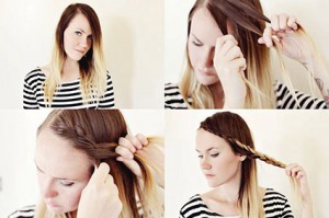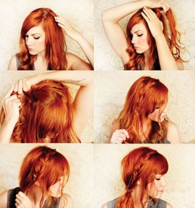 Как делать? Расчеши волосы и сделай косой пробор. Отдели прядь у лба, нанеси на волосы немного пенки для укладки, снова расчеши прядь и раздели ее на три равные части. Теперь начинай плести простую косу. Когда дойдешь до височной части, начинай захватывать по очереди волосы с разных сторон и вплетать их в косу. Заплети косичку до конца и завяжи хвостик резиночкой.