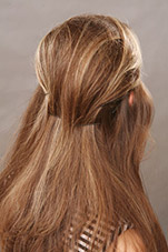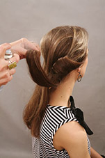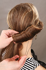 Зачесываем назад волосы с макушки и чуть-чуть с боков, оставляя нетронутыми самые крайние локоны. Закрепляем плоскими шпильками-невидимками. Поочередно берем оставшиеся пряди, начиная с висков, и закручиваем их внутрь, но не очень туго, чтобы получились этакие валики. Если волосы у тебя непослушные, можно сначала их слегка начесать и сбрызнуть лаком. Каждую прядь закрепляем шпильками.