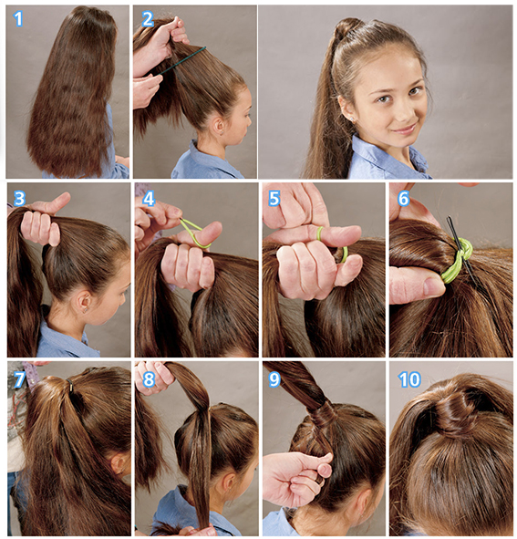Расчеши волосы гладко-гладко, иначе получится неаккуратно. Можно зафиксировать их лаком. Затем подними всю массу как можно выше. Закрепи на резинке шпильку-невидимку, как показано на фото. Оберни резинку вокруг «хвоста», не надевая на него. Закрепи шпилькой.