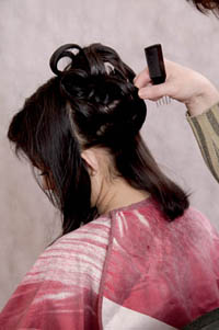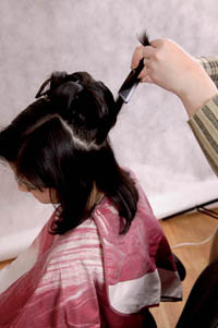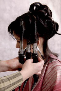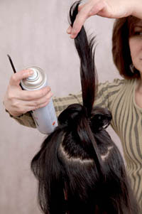 Хвост делим на несколько прядей. Каждую хорошенько обрабатываем лаком, чтобы из нее можно было вылепить любую фигуру, закручиваем колечком, а потом закрепляем это художество маленькими шпилечками или заколочками (кстати, постарайся расположить их так, чтобы они «опирались» на кожу плоской стороной, а не острой).