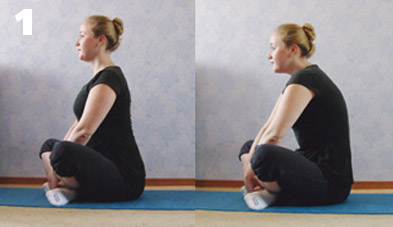 Сядь по-турецки (в йоге эта поза называется «Простая поза», так мы и будем ее называть в дальнейшем). Возьмись руками за лодыжку одной ноги (рис. 1). Сделай вдох и прогни позвоночник так, чтобы грудная клетка поднялась вверх. Выдохни и прогни позвоночник назад (спина – дугой). Голова при этом должна находиться в одном положении, не наклоняй ее и не запрокидывай. Повтори прогибы 26-108 раз (сделай столько, сколько сможешь). Не удивляйся странным цифрам. В философии йоги они имеют особый смысл. Когда почувствуешь, что позвоночник начинает «разогреваться», увеличивай темп, не забывай правильно дышать. В конце сделай глубокий вдох, ляг на спину и отдохни 1 минуту.