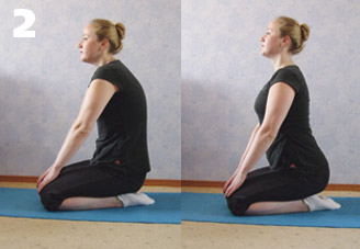 Сядь на колени, положи руки ладонями вниз на бедра (рис. 2) и в этой позе повтори первое упражнение 26-108 раз. В конце сделай глубокий вдох, ляг на спину и отдохни 2 минуты.