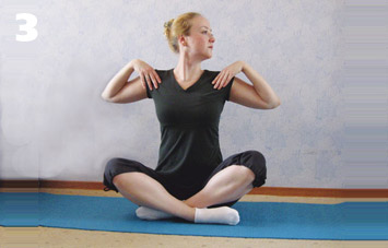 Сядь в Простую позу, положи руки на плечи (рис. 3). Сделай вдох и поверни корпус влево. Затем на выдохе повернись вправо. Дыши медленно и глубоко. Повтори 26 раз. Когда окажешься в центральном положении, сделай вдох, а потом выдох. Ляг и отдохни 1 минуту.