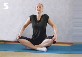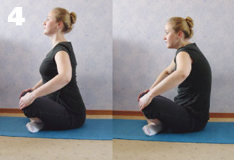 Вернись в Простую позу и положи руки на колени (рис. 4). Держи их крепко. Вдохни и прогни верх корпуса вперед. Выдохни и выгнись назад. Продолжай в том же духе 26-108 раз. Увеличивай темп, дыши энергично и следи, чтобы локти не сгибались. В конце упражнения сделай вдох-выдох и отдохни лежа 1 минуту.