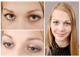 На верхние веки (до самой складки) наносим мерцающие розовые тени с перламутровым или серебристым блеском. Затем – лилово-розовый, сиреневый или сливовый тон выше складочки. Мягким аппликатором легонько растушевываем границу между двумя оттенками. Теперь – белые тени на самую верхнюю часть века, до уровня бровей, вплоть до височной кости. И вновь не забываем растушевать.