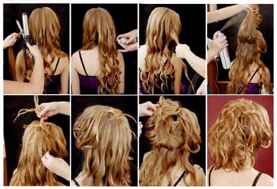 Завиваем волосы, обрабатывая при этом их лаком, чтобы получились мягкие волны. Далее поочередно подкалываем пряди наверх шпильками-невидимками или маленькими заколочками в живописном беспорядке, разделив шевелюру на три горизонтальных яруса. Сначала закрепляем верхний — прядки с макушки, затем средний, с затылка, и последний — с самой нижней. В процессе все пряди перевиваем между собой.
